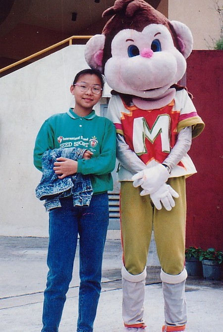 About 12 years old, can you see I was afraid because of the big monkey beside me.